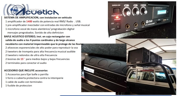 Lo más avanzado en calidad y poder en sonido para anunciar mensajes, con o sin música, con efectos de anuncio, su calidad de sonido permite que la población objetiva, pueda escuchar claramente la promoción y anuncio de lo que se publicita. El uso de este sistema permita la máxima eficiencia durante el tiempo y espacio.