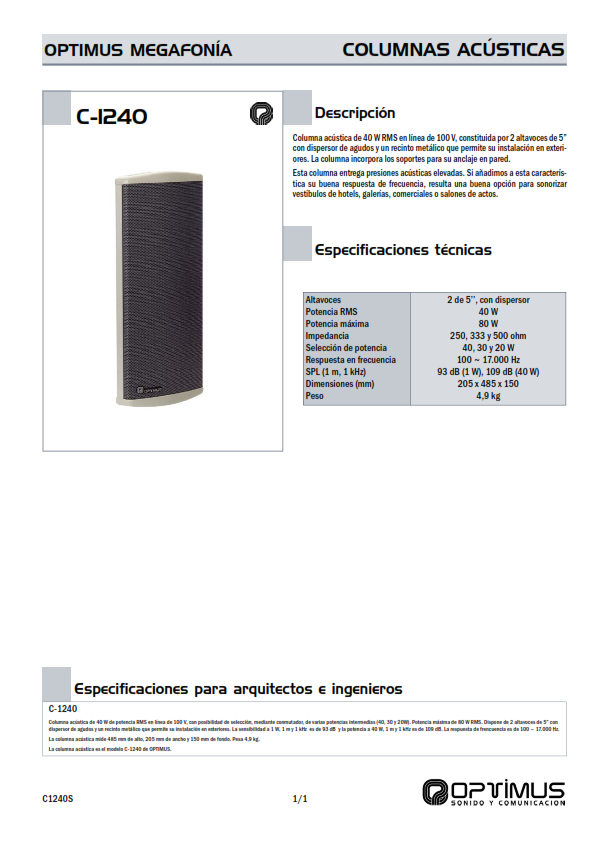 Columna acústica de 10 W de potencia RMS (seleccionable a 5 y 2,5 W), línea de 100 V. Apto para instalaciones de alarma por voz (VA: Voice Alarm) según norma BS-5839 / EN 60849 parte 8. Con 2 altavoces, 1 woofer de 3 “y 1 tweeter de 2”. Filtro de palabra centrado en 400 Hz. SPL a 1 m y 1 kHz de 85 dB (1 W) / 95 dB (40 W). Respuesta en frecuencia 170 ~ 20.000 Hz. Ángulo de dispersión de 190º (H) x 150º (V). Dimensiones 222 x 94 x 95 mm. Soporte en L ajustable, para orientar el haz acústico de la columna en la zona de cobertura. Recinto y reja fabricados en acero, color blanco RAL 9003. Peso 1,3 Kg. Modelo OPTIMUS C-710VA