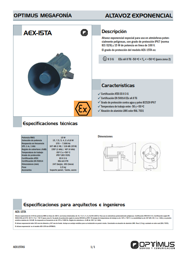 Altavoz exponencial de boca circular con una potencia de 15 W eficaces, un puerto RJ45 y una interfaz de red 10/100 Base-TX. La alimentación es mediante PoE, con tecnología VoIP, y protocolo SIP. Tiene una respuesta en frecuencia de 400 a 8.000 Hz, una sensibilidad (1 W, 1 m, 1 kHz) de 101 dB…
