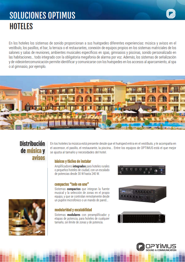 En los hoteles los sistemas de sonido proporcionan a sus huéspedes diferentes experiencias: distribución de música y avisos vestíbulo, pasillos, bares y restaurantes, sistemas matriciales para salas de actos y de reuniones, equipos de audio específicos para spas, gimnasios y piscinas, sonido personalizado en las habitaciones… todo integrado con la obligatoria megafonía de alarma por voz.
